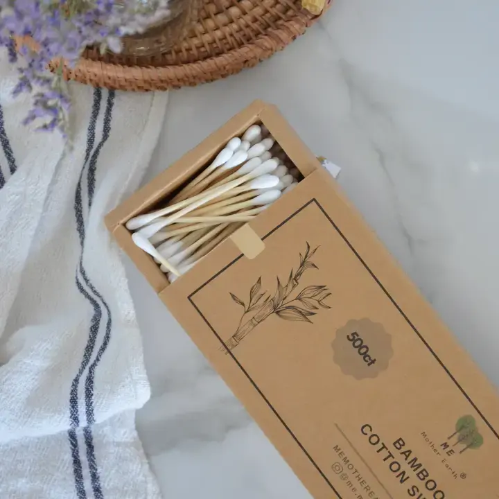 Choose eco-friendly, zero-waste bamboo cotton swabs made with soft organic cotton and sustainable bamboo sticks for safe, effective everyday use. Packaged in a recycled paper box, these plastic-free swabs are a healthier, environmentally responsible alternative to conventional cotton swabs, helping reduce waste while supporting a cleaner, safer planet.